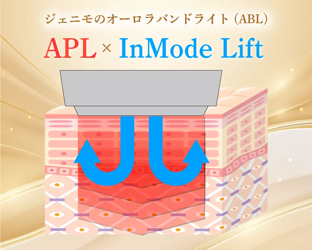 業務用脱毛機ジェニモに搭載されたABL光フェイシャルモードは、従来の光フェイシャル(IPL)を超える効果を提供し、シミ、シワ、たるみなど、さまざまなお悩みにアプローチします。