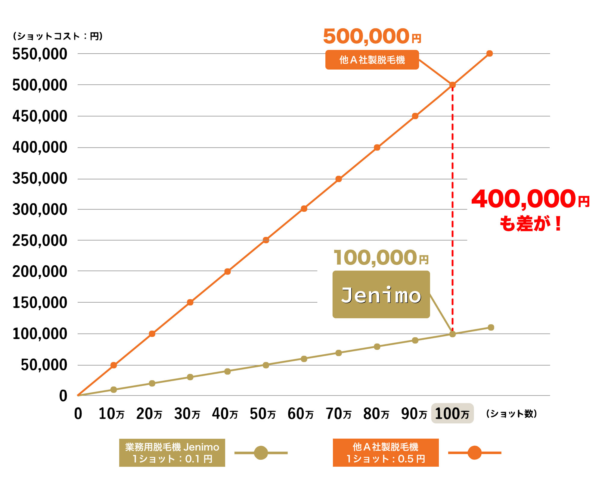 他A社製脱毛機の0.5円と比べると、100万ショット使用した場合、40万円ものコスト差が生まれます。