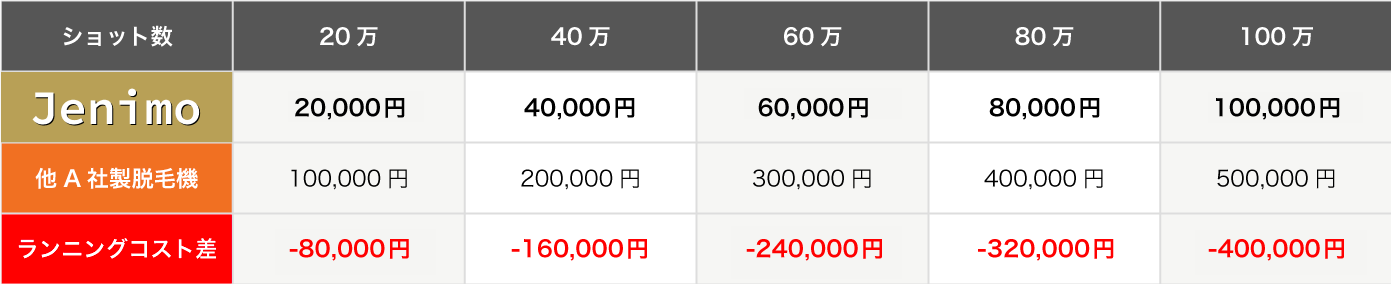 全身脱毛に必要なショット数が約2,000ショットと仮定すると、ジェニモのコストは約200円です。これに対し、他A社製の脱毛機では同じ施術で1,000円以上かかることもあり、ジェニモの方が大幅にコストを抑えることができます。