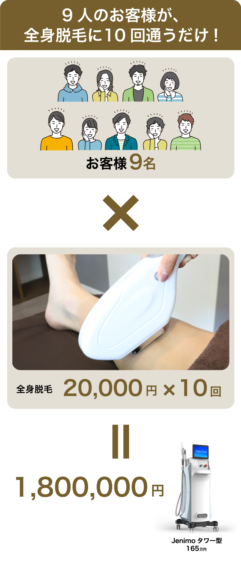 ジェニモ(タワー型)の本体代金は165万円(税抜)です。1人のお客様が10回の脱毛を完了することを想定すると、約9人のお客様で導入費用を回収できます。低コストのランニングで、高い収益性を実現します。